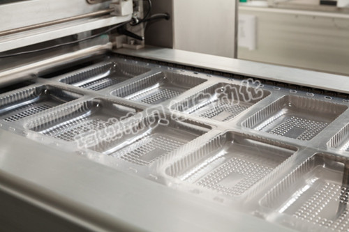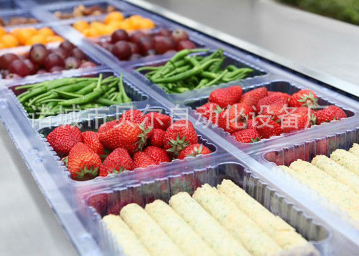 二、應用范圍 熱成型氣調包裝機廣泛用于生熟肉、禽、魚以及果蔬等休閑食品,面包、糕點和盒飯等食品的盒式包裝和袋式包裝,它利用CO2、O2、N2等保護性混合氣體所起的不同作用,有效抑制微生物生長繁殖。經過氣調包裝的食品,較好地保持了食品原有的口感、色澤、形狀及營養,同時可達到較長的保鮮期。 三、性能特點及原理 (1)本機適合各式食品的盒式包裝,連續自動完成抽真空、自動混合保鮮氣體(通常為CO2、N2、O2)、充氣、封口包裝、分切,包裝成品排出等步驟; (2)可完成復合膜、單膜、共擠膜等不同材質的包裝膜和包裝盒進行封口包裝; (3)伺服電機驅動,由可編程序控制器(PLC)配合觸摸屏實現人機界面對話,各部分動作及控制參數均可由PLC設定、修改。控制方便可靠,精確靈活,故障率低; (4)整體式鋁合金側板支架(貝爾國家專利號ZL2004 2 0039098 3),強度高,直線度好,主體采用SUS304食品級不銹鋼材料制造,設備表面易清洗; (5)封口壓力、溫度和時間等參數可以精確控制,確保產品封口達到理想效果; (6)光電跟蹤蓋膜圖案,確保包裝印刷圖案的完整; (7)模具形狀可按客戶選定的包裝盒樣式進行定制; 四、主要技術參數 見附件